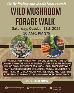 In this workshop you will learn how to identify different wild edible and medicinal mushrooms that grow in the fall. We will start with a short qigong class taught by Erik outside Shadle Farm’s hemple. Then we will go down the street to a local park to identify wild plants and mushrooms of autumn. We will come back to the farm to talk about what we found and have refreshments provided by Ami and Mark from G-Monkey. Learn what mother earth has to offer for food, medicine, and more..